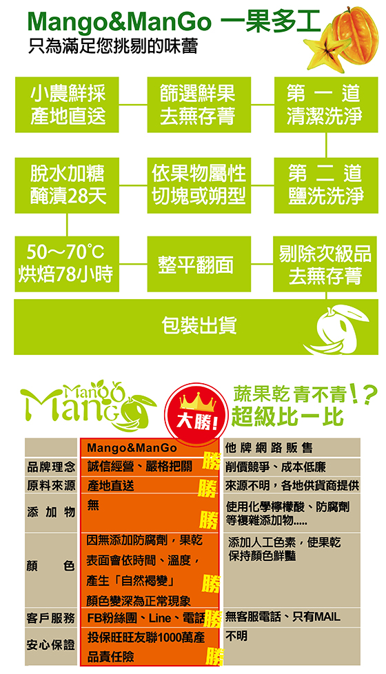 | 呷好茶點,團購首選 大人氣台灣在地鮮果乾                          系列:【Mango&ManGo芒果杯杯】鮮果乾 品名:芒果青乾規格:120g±10%/包 成分:土芒果、糖、鹽 注意事項:本產品含有芒果,不適合其過敏體質者食用。品名:芭樂果乾規格:100g±10%/包 成分:芭樂、糖、鹽 品名:聖女番茄果乾規格:120g±10%/包 成分:聖女小番茄、糖、鹽 品名:楊桃果乾規格:100g±10%/包 成分:楊桃、糖、鹽 品名:無籽香Q梅肉規格:160g 成分:青梅、糖、食鹽、小茴、大茴、肉桂、丁香、川椒、白芷 添加物名稱:葡萄糖、蔗糖素甜味劑、甘草萃甜味劑、香草香料、苯甲酸防腐 劑、偏亞硫酸氫鈉(食品用漂白劑) 產地:台灣 保存期限:一年 有效期限:依外包裝所標示 投保產品責任險字號:旺旺友聯1203第04PL0N000022號 品名:紫蘇梅規格:180g 成分:青梅、糖、食鹽、紫蘇葉、紫蘇香料 添加物名稱:蔗糖素(甜味劑)、甘草萃(甜味劑)、苯甲酸(防腐劑)、 乙基麥芽醇(甜味劑)、偏亞硫酸氫鈉、食用色素黃色五號。 產地:台灣 保存期限:一年 有效期限:依外包裝所標示 投保產品責任險字號:旺旺友聯1203第04PL0N000022號 品名:茶葉梅規格:180g 成分:青梅、糖、食鹽、茶葉、烏龍茶香料 添加物名稱:青梅、糖、食鹽、茶葉、烏龍茶香料。 產地:台灣 保存期限:一年 有效期限:依外包裝所標示 投保產品責任險字號:旺旺友聯1203第04PL0N000022號 檢驗名稱:SGS-398農藥檢驗 檢驗編號及說明:VA/2015/52673冷凍芒果青-通過398項農藥檢驗合格 ※因製作/包裝過程繁複,實品規格可能會有些許誤差 ※爲保持產品最佳風味,開封後請盡速食用完畢 | 詳細商品說明 | 網友也都知道在定價和網路售價會有一定的差距,AMANDA也嘗試積極推荐,並介紹我該商品優缺點。AMANDA不吝嗇分享他的生活點點滴滴;包括網路上購買的任何東西.要到處比價;尋找低價及可靠的網購地方!AMANDA是我的好朋友,為人正直又有愛心;AMANDA他只會推荐好東西! | 下面是整理過的資料;有Mango&ManGo芒果杯杯-鮮果乾與其他類似值得參考的商品清單.Mango&ManGo芒果杯杯-鮮果乾該商品熱烈銷售中~ 避免向隅,欲購從速~google找一下有些人再熱烈討論Mango&ManGo芒果杯杯-鮮果乾.還有去各大拍賣網站RUTEN露天、YAHOO拍賣收集商品資料!網路購物EC是擋不住的趨勢,可以方便比價只要用功通常都能買到相對便宜的商品! | ※其他推薦※