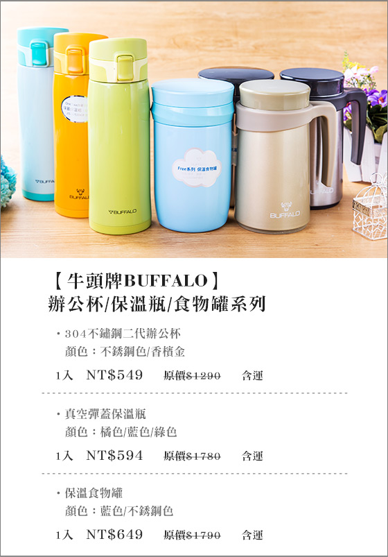現在很多線上購物EC平台都有銷售該商品!雅虎購物、momo購物及博客來是我比較常去逛的EC網購平台,常常有優惠商品可撿便宜。最近我也在找牛頭牌BUFFALO-辦公杯/保溫瓶/食物罐系列的相關資訊~SAMUEL也請我幫忙收集該商品資料!google找一下有些人再熱烈討論牛頭牌BUFFALO-辦公杯/保溫瓶/食物罐系列. |  | 牛頭牌BUFFALO-辦公杯/保溫瓶/食物罐系列-上班族必備!體積輕巧好攜帶、耐久保冷保溫功能,想喝杯熱咖啡、茶飲或是暖呼呼熱食,牛頭牌都能帶給你!只要549元起(含運)即可購得【牛頭牌BUFFALO 售價:549