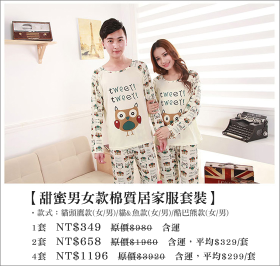 | 甜蜜男女款棉質居家服套裝-最佳couple套裝,在家也要放閃!舒適棉質面料,透氣更好穿,款式俏皮,和親愛的穿一樣才有家的感覺!平均每套最低只要299元起(含運)即可購得甜蜜男女款棉質居家服套裝1套/2 售價:299