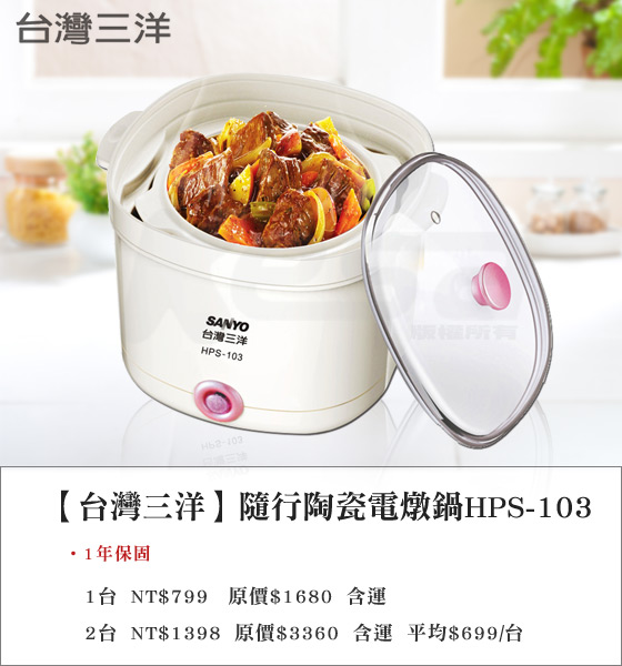 台灣三洋-隨行陶瓷電燉鍋(HPS-103)該商品熱烈銷售中~ 避免向隅,欲購從速~我有去遍尋各大購物網站momo購物、yahoo奇摩購物、博客來、PChome線上購物、ibon mart搜尋優惠價格!要到處比價;尋找低價及可靠的網購地方!一直以來我都很相信KEVIN推荐的東西。雅虎購物、momo購物及博客來是我比較常去逛的EC網購平台,常常有優惠商品可撿便宜。