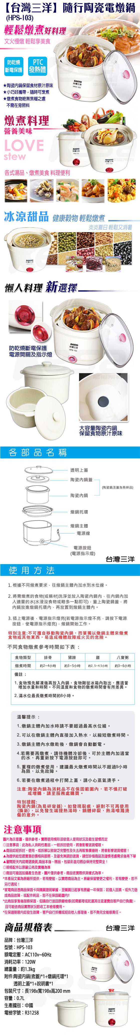 【台灣三洋】隨行陶瓷電燉鍋HPS-103